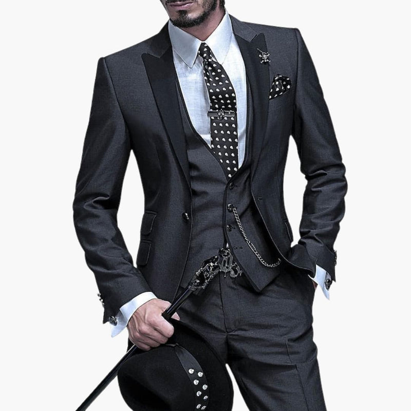 Men’s slim-fit three-piece suit featuring contrast lapels and matching waistcoat